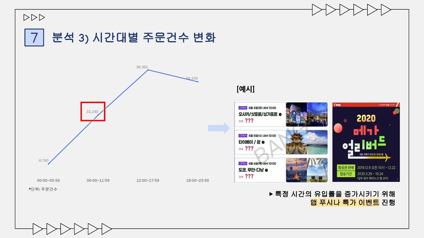 ③ 시간대별 주문건수 변화 → 특정 시간의 유입률을 증가시키기 위해 앱 푸시나 특가 이벤트 진행
