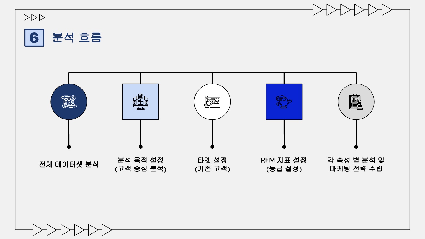 전체 데이터셋 분석 → 분석 목적 설정 (고객 중심 분석) → 타겟 설정 (기존 고객) → RFM 지표 설정 (등급 설정) → 각 속성 별 세부 분석 및 마케팅 전략 수립