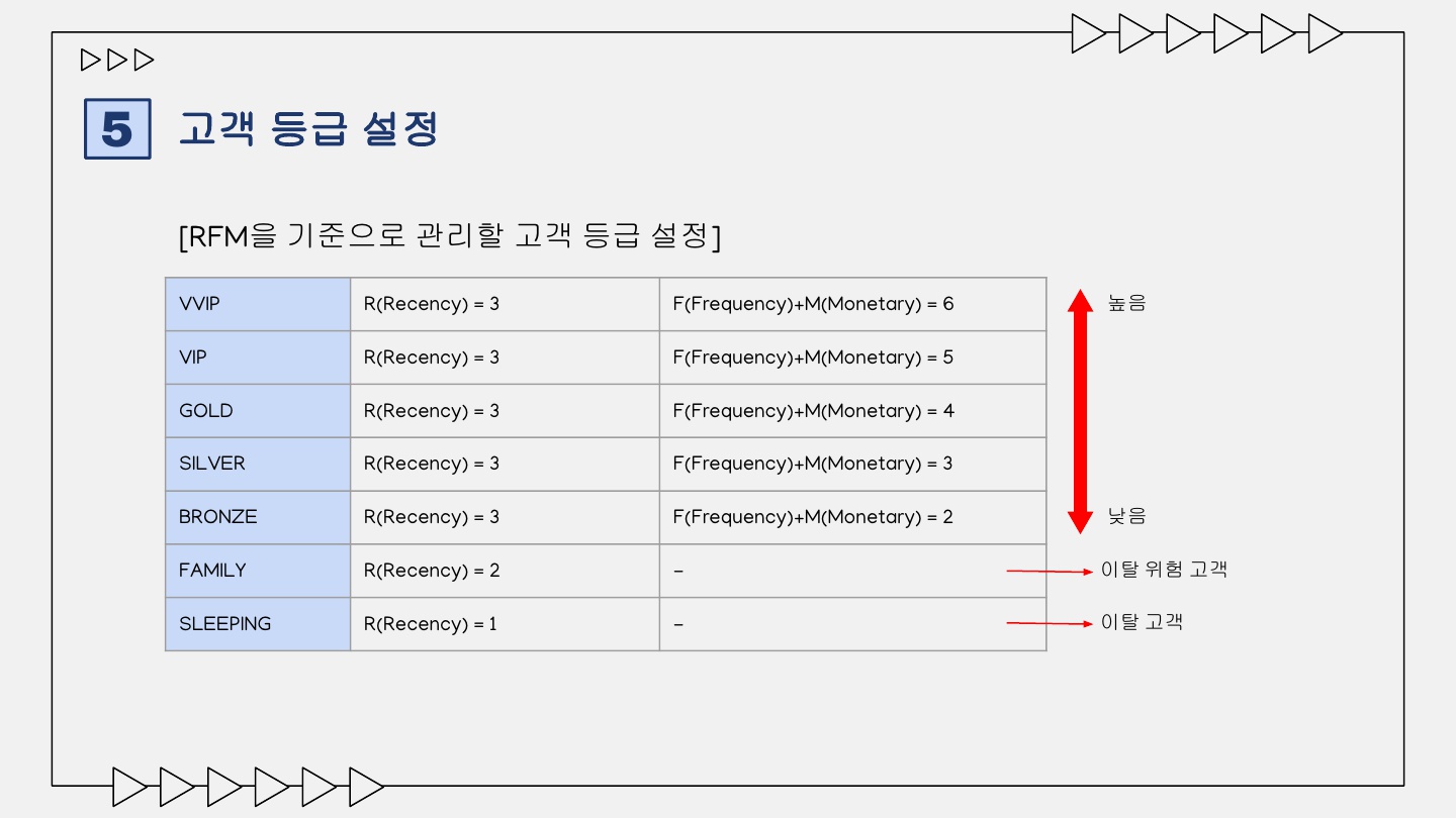 ✔ RFM 점수를 기준으로 설정한 고객의 등급을 보여줌 (VVIP ~ BRONZE, FAMILY, SLEEPING 등급)
