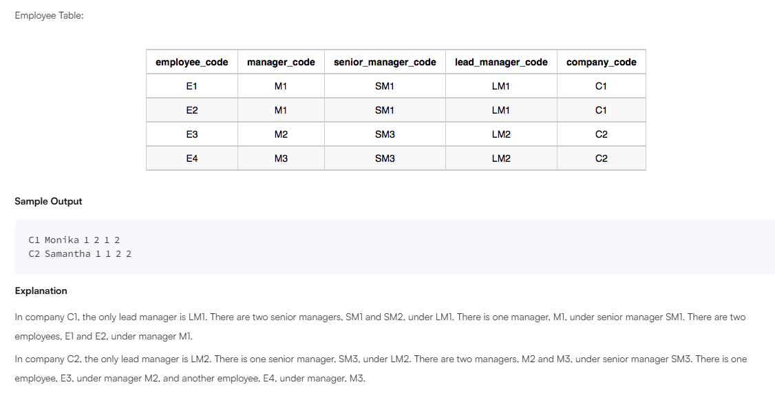 회사코드와 창립자, 그리고 각 회사 별 lead_manager, senior_manager, manager, employee의 수를 조회하는 문제이다.