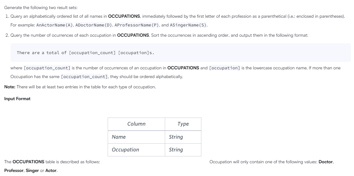 SELECT OCCUPATION, COUNT(NAME) AS CNT FROM OCCUPATIONS GROUP BY OCCUPATION