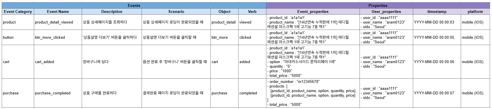 전체 이벤트를 리스트업하고 중복되는 이벤트가 없으며, 필요한 속성 정보가 모두 반영되도록 정리하였다.
