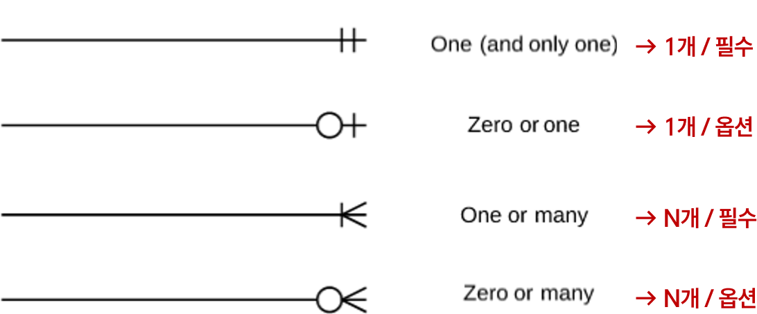 - Optionality : 필수면 세로바(|)로 표현하고, 선택 가능하면 (옵션) 동그라미 (○)로 표현한다.