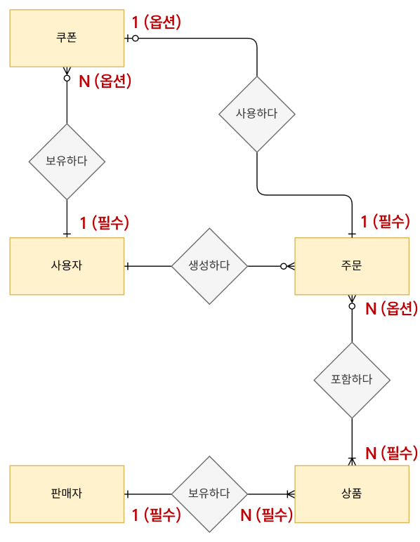 | 주문 (1) : 쿠폰 (1 or 0) | - (C) 하나의 주문에는 최대 하나의 쿠폰만 적용되거나, 사용되지 않을 수도 있다. - (O) 주문에게는 쿠폰이 있을 수도 있고 없을 수도 있으며, 쿠폰에게는 주문이 반드시 있어야 한다. |
