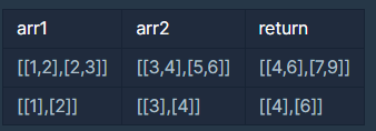 문제 설명 행렬의 덧셈은 행과 열의 크기가 같은 두 행렬의 같은 행, 같은 열의 값을 서로 더한 결과가 됩니다. 2개의 행렬 arr1과 arr2를 입력받아, 행렬 덧셈의 결과를 반환하는 함수, solution을 완