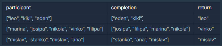 완주하지 못한 선수 문제 설명 수많은 마라톤 선수들이 마라톤에 참여하였습니다. 단 한 명의 선수를 제외하고는 모든 선수가 마라톤을 완주하였습니다. 마라톤에 참여한 선수들의 이름이 담긴