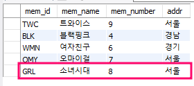 insert into member values('GRL', '소녀시대', 8, '서울');
