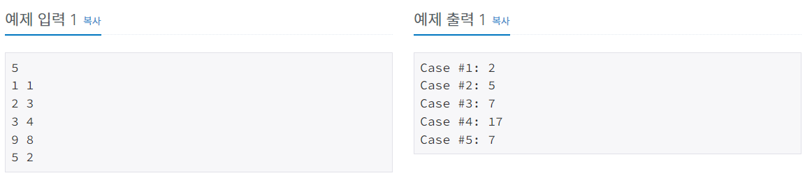 각 테스트 케이스마다 "Case #x: "를 출력한 다음, A+B를 출력한다. 테스트 케이스 번호는 1부터 시작한다.